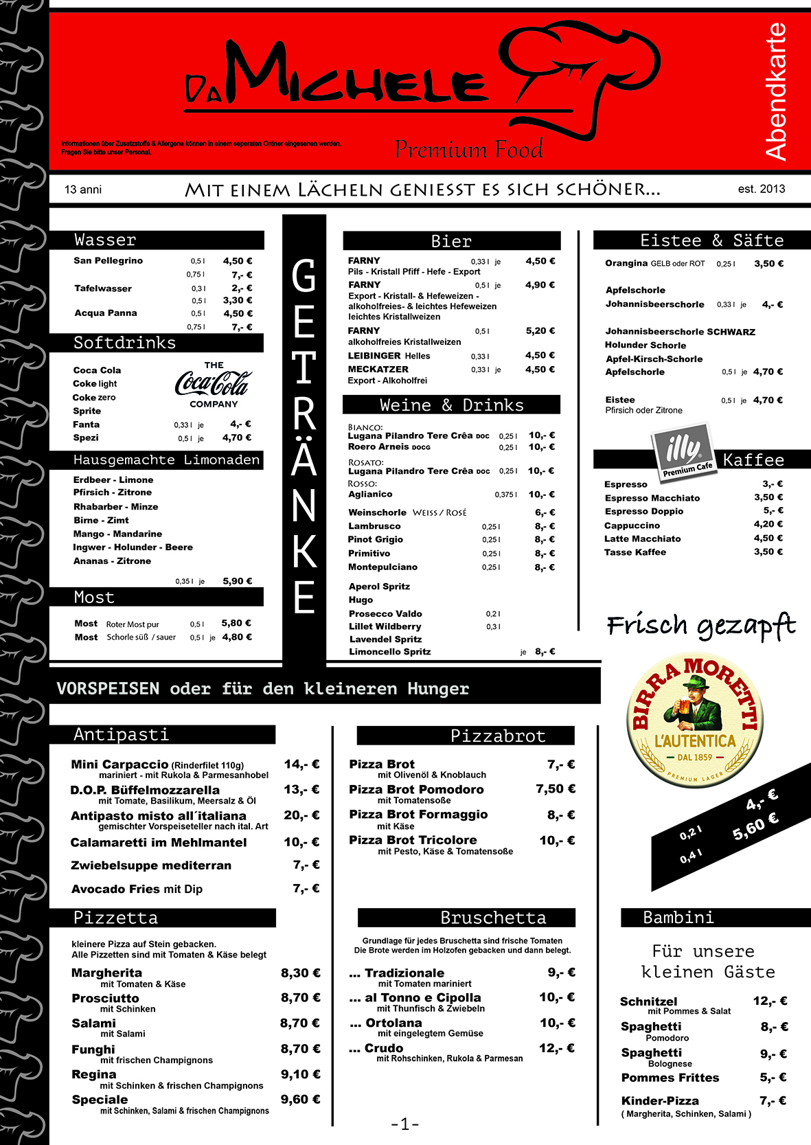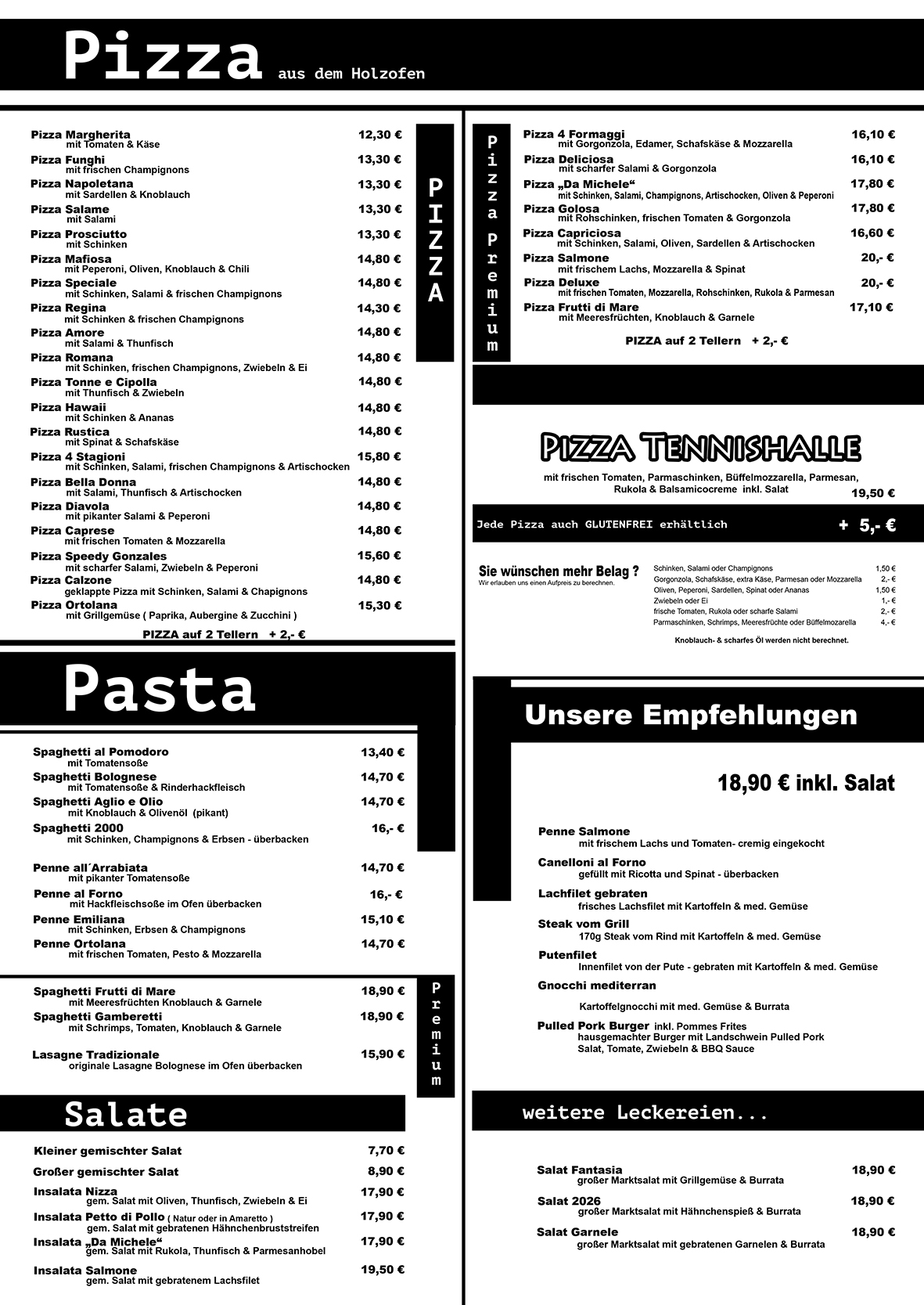 Abendkarte Pizza Pasta Fleisch Fisch Salate
